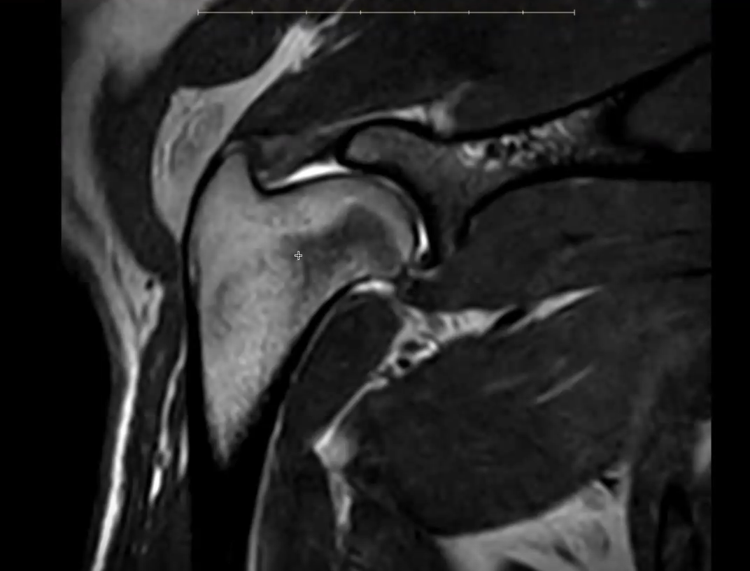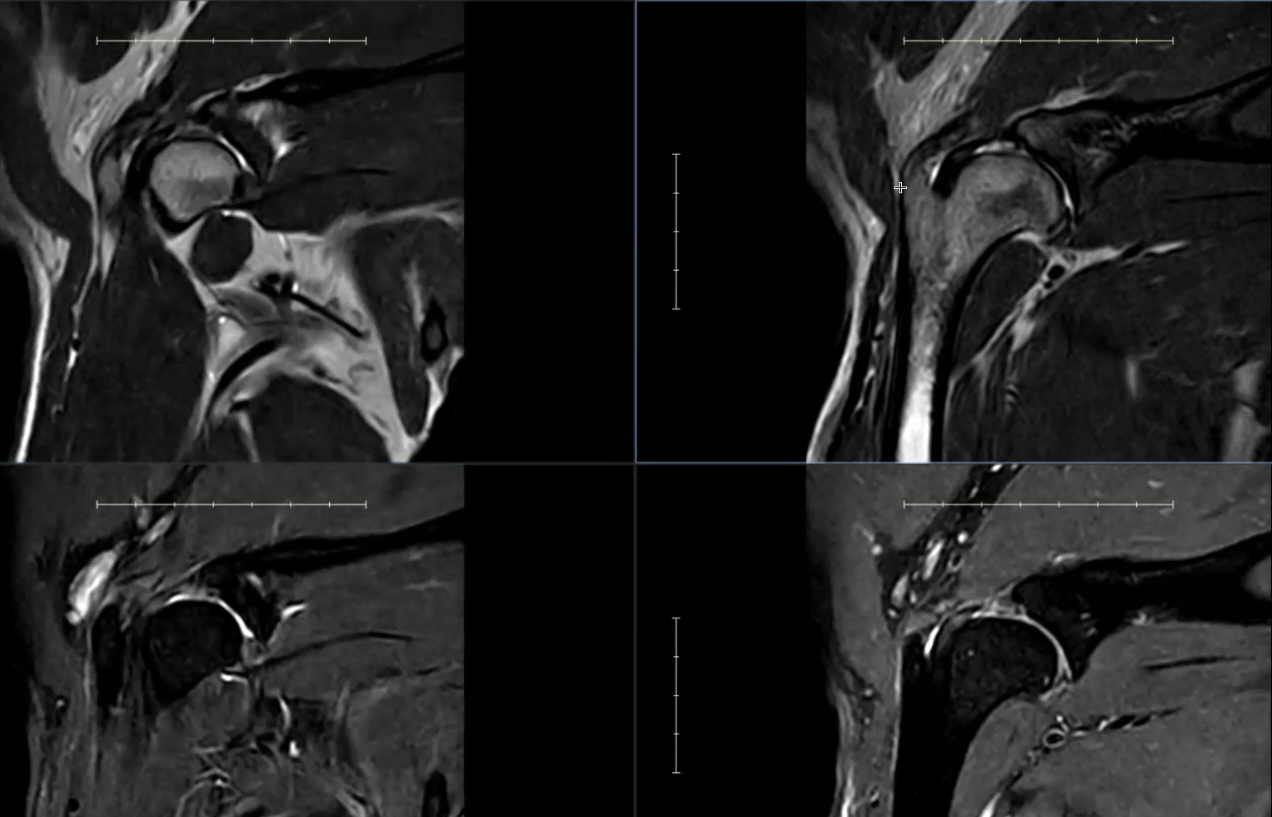 Close-up MRI view of Kal's shoulder joint, showing the structures involved in his tendon and joint inflammation.