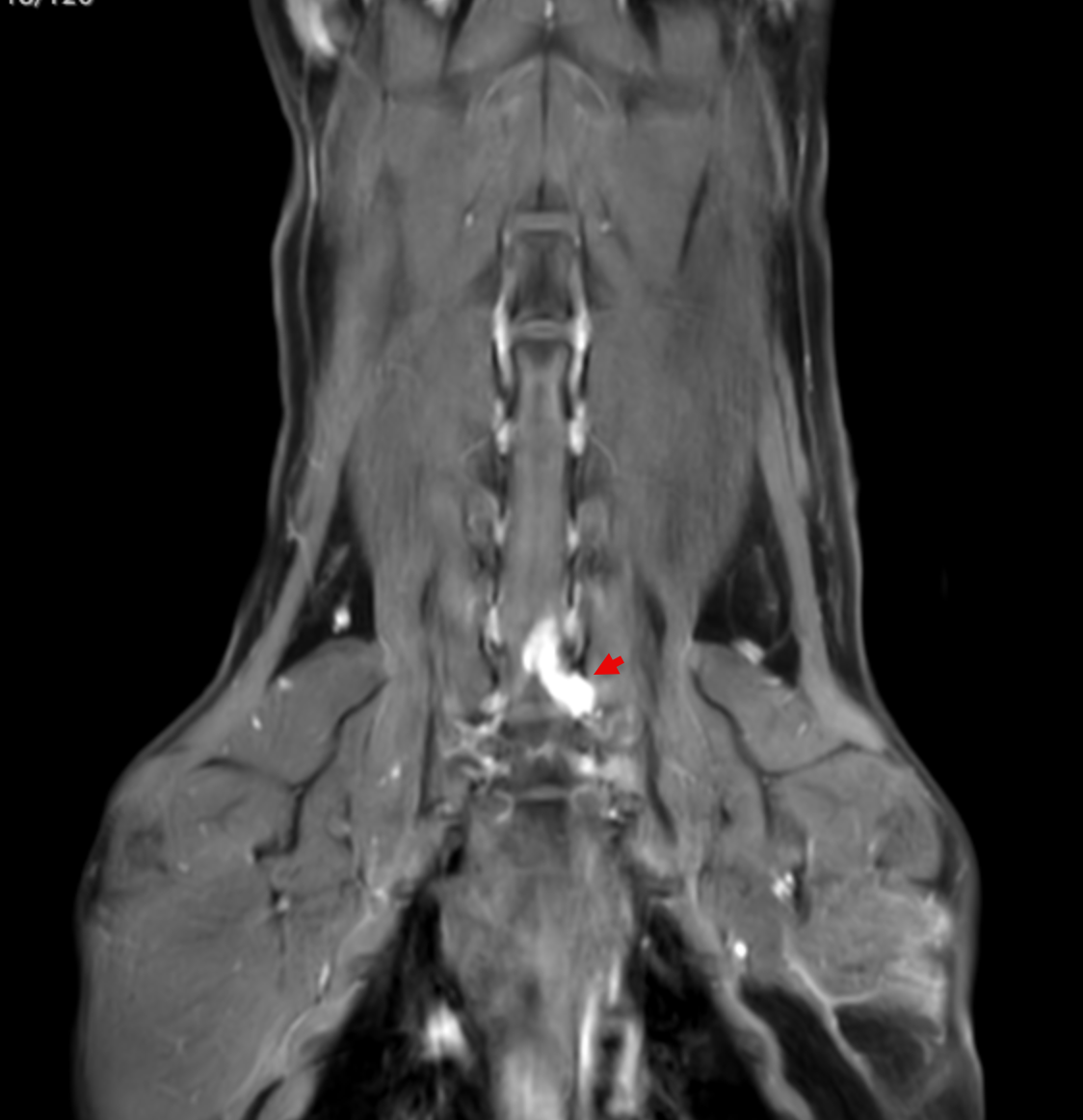 Image 5. Dorsal post-contrast MRI of the cervical spine and thoracic inlet demonstrating a contrast-enhancing lesion associated with the left-sided C7–T1 nerve roots extending into the brachial plexus.