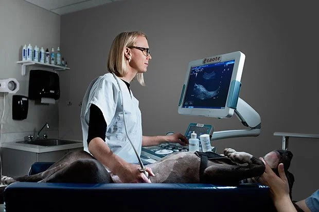 A veterinary professional performs an ultrasound exam on a relaxed dog to capture real-time images of internal organs. Photo Credit.